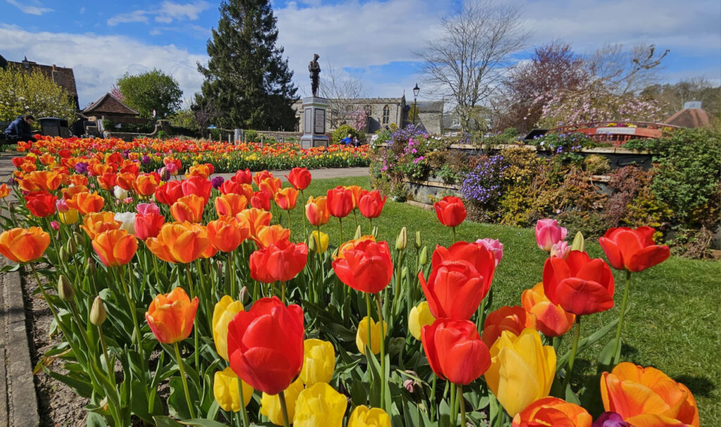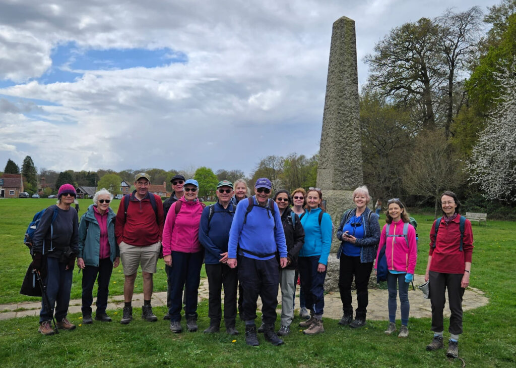Chris Hughes writes: The day dawned bright and sunny for the four villages walk from Amersham station. Thirteen walkers walked down the hill to the car park where we were joined by two more. Flapjack was given out to the group to encourage them on the walk. We left Amersham Old Town to walk up the hill to Coleshill, our first village. From there we walked to Winchmore Hill, where we enjoyed a short break. Our next village was Penn Street, where we stopped for a photo by the war memorial. We walked across the common and into Penn Woods. Having crossed the busy A404, we walked along and down Toby’s Lane. The path was very pretty – lined with bluebells and greater stitchwort. Nearing the end of the path, we branched off to the left and diagonally crossed a field with a lovely view of Little Missenden and the surrounding hills. After lunch and a drink in The Red Lion, we walked along the valley, passing Shardeloes Lake and back into Amersham Old Town. We admired the beautiful display of tulips in the memorial gardens and then it was back up the hill to the station.