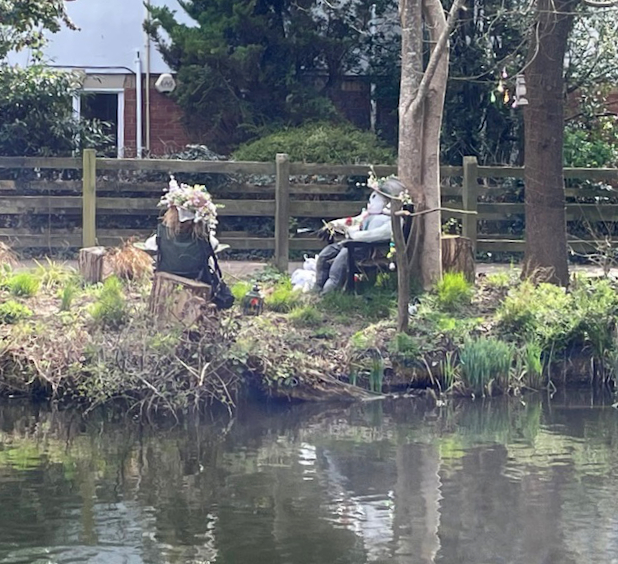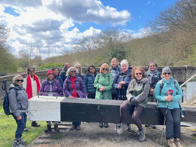 As we followed the canal we stopped to watch a pair of gold crests busy nest making in the hedge at head height, then spied a couple of mannequin bargees dressed in Easter finery, and a beautiful pair of Mandarin ducks. Turning left at Cassiobury lock, through the woods, then discovering huge fields of old head-high sprout plants, we passed the gem of old Waterfell House, before coming out onto Croxley Green with our lunch spot at The Coach and Horses.